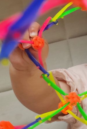 目の前にあるものをギュッと握ってみたら、、、ブンブン振ってみたり、ぱ! と、手放したときにゆらゆら揺れる様子が楽しくって、その動きを見つめながら一緒に揺られたり・・・✨