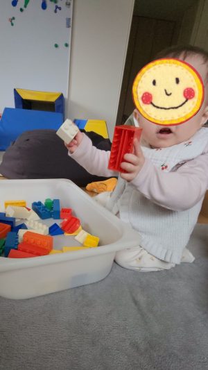 わたしも作れるかなぁ〜??? ガサゴソ両手を動かしてブロックを取り出して、カチャカチャ合わせて大喜びです♬