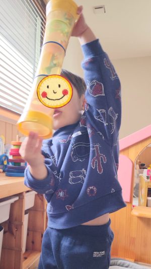 中に入っている球が楽しい音をいっぱい聴かせてくれるので、楽しくって、ぐい〜んと背を伸ばしながら何度も披露してくれます♬
