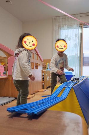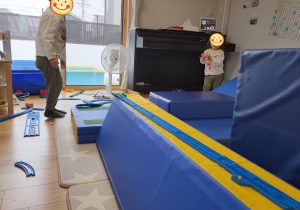 そうだ!!! と、思いついたのは、平均台マットの上にプラレールを繋げていきます♬
