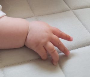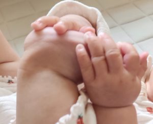 ごろ〜んと寝返りをすると、パンパン手を動かします!
