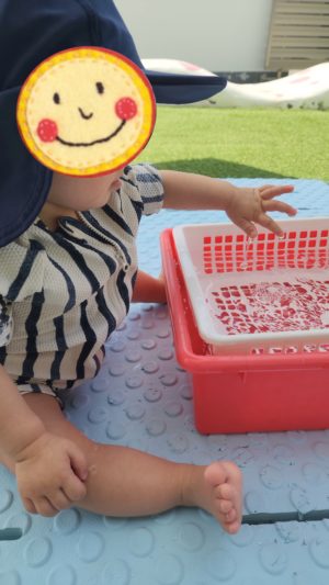 そ〜っとタライの中に手を入れてみると、、、ひんやり!!