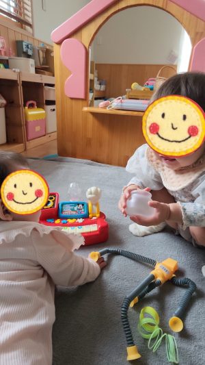 楽しい音が聞こえてくるおもちゃをポンポン叩いてニコニコ笑い合う2人♡