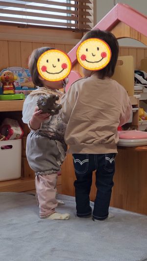プンスカ怒り続けていましたが、、、抱っこ紐の中でお友達の遊んでいる様子を見ていると、ちょ〜とずつ落ち着いていきました♡