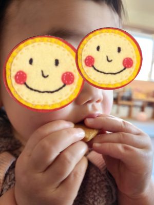 アンパンマンのクッキーを一つずつ取り出して、キャラクターの名前を確認しながらパクパク食べていました♬