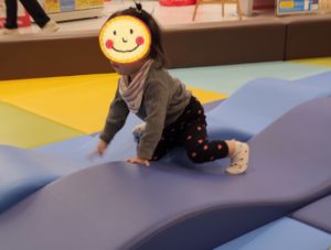 ふわふわマットの上を渡り歩くのも楽しい! バタン!と、倒れても大丈夫なので、勢いがちょっとずつ増していきました♬