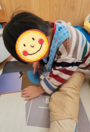 サイコロを使って、双六をしている子が近くにいて、 サイコロが魅力的で触りたい。 でも、、、知らない子が使っているので、持って行ってはいけないこともよ〜くわかっているので、手は伸ばしません。