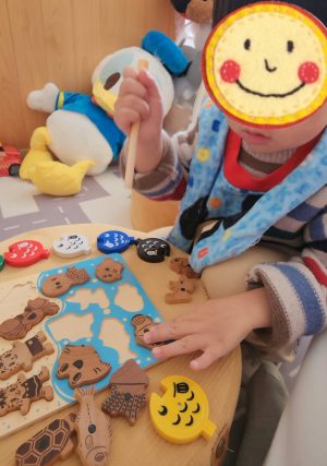 パズルのお魚釣りも丁寧にくっつけて、ここかなぁ〜? こっちかなぁ〜??? と、置いていきます🐟