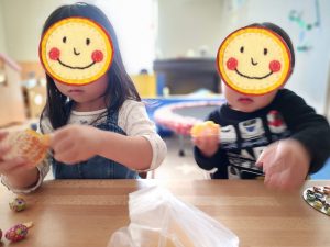 お買い物ごっこで沢山買ってきたようで、おっきな紙袋を持ってきてくれました♡