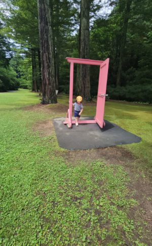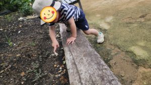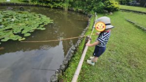 ザリガニさんのいる池で釣り体験!!! 自分の体よりも長い竿を持って自分で釣るんだ!!! と、張り切ってブンブン振り回します💦