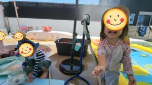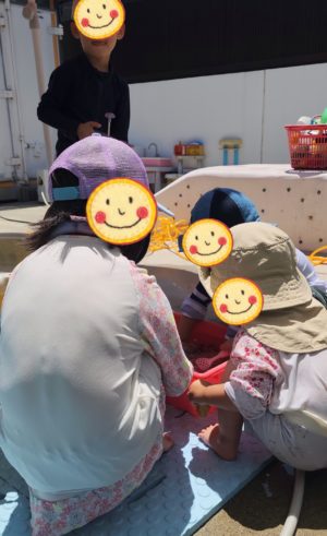 いろんな容器にたっぷりお水を入れて、じゃ〜っと流し落としたり、おでこをチョンとお水の中に入れてみたり、それぞれのお水との触れ方を楽しみます!!!