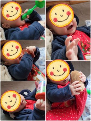 おもちゃをぎゅっと握って、ブンブン振ったり、あ〜む! と、大きくお口を開けたり、 これはなんだ???? と、自分の足をキャッチしたり、とっても楽しそうです♡