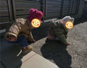 寒いけど、、、お外に行きたい! と、靴を持ってスタンバイしてくれていたので、お外に出たら、スロープに埋めてあるビー玉に夢中になって動かない2人♬