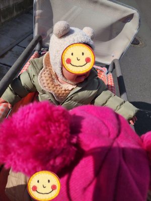 お散歩カーに乗ってレッツラゴ〜!!! と、出発したのですが、、、寒さにやられちゃってご機嫌を損ねてしまったので、、、すぐにUターンとなりました♬