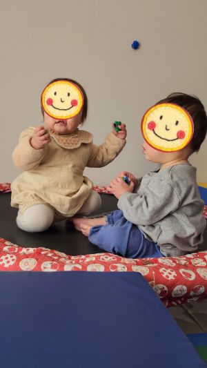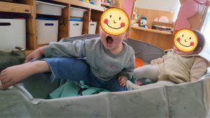 トランポリンに上るとぴょんぴょん跳ねたり、マグネットを壁から取ってにぎにぎしながら聞こえてくる音楽に合わせてノリノリでした♬