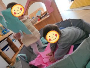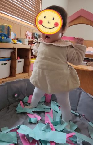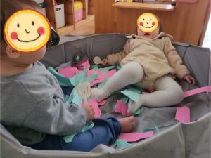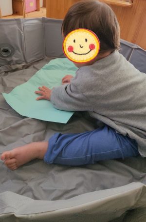 こんな遊びはどうかなぁ〜??? と、紙を渡してみると、、、むぎゅ〜!ぱんぱん! ポンポン!バサバサ〜!!! と、いっぱい触れます!!!