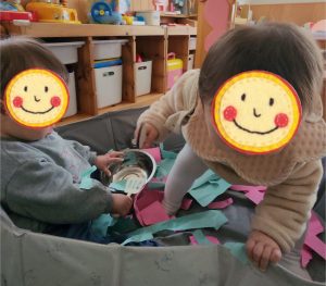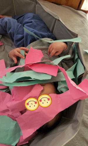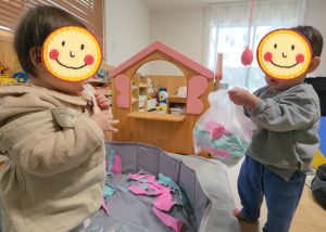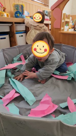 ぐちゃぐちゃ〜!!!!!! 細かくなってきた紙を勢いよく弾くのも楽しすぎて、おっきな声が響きます✨