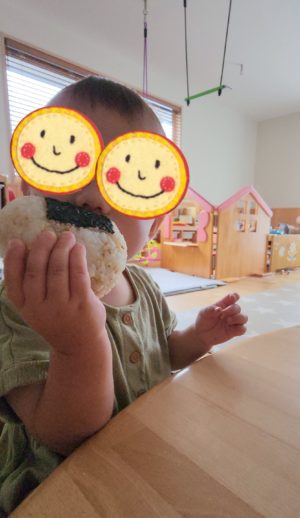 じゃ〜ん!!! おっきなおにぎりを早く食べたくてウズウズしていたので、おにぎりを手にすると、おっきなお口を開けて頬張り始めました🍙