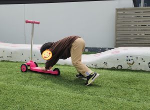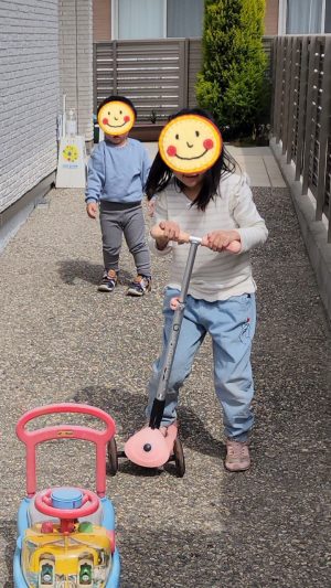 お外に出ると、すぐにキックボードに乗って走ります!!!