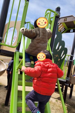 女の子もいつもはとびつくのですが、、、今日はなんだか控えめ。 男の子たちが行ったところには一緒に行くのですが、、、もっと大きな方の遊具にはちょこっと行ってすぐに戻ってきました🌿