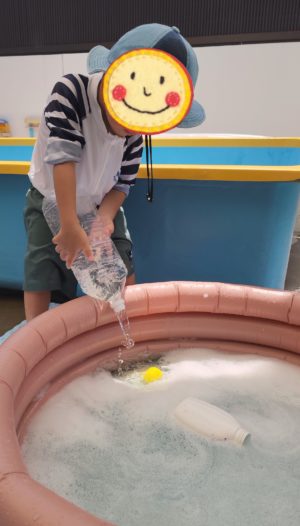 ボトルに入れたお水を泡の中にじゃ〜っと落とすと、泡が消えた〜!!!