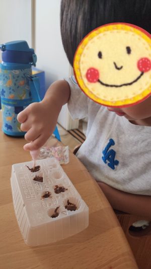 チョコをそ〜っと流し入れて、飾り付けも丁寧にしていきます🍫
