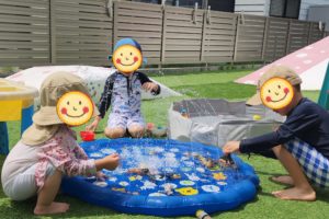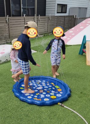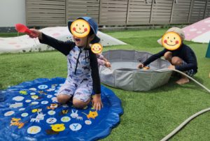 その後方ではビニールプールにお水を貯めながらおもちゃを入れて、水流に流されていく様子を見て大喜びです!!