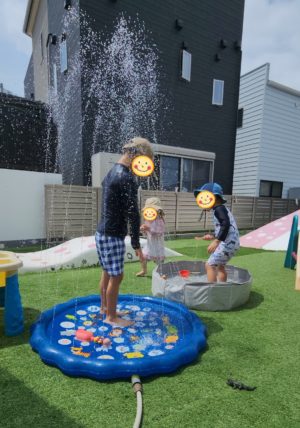 噴水マットを広げた時はちょろちょろだったお水だったのが、、、あっという間に大きく舞い上がってびっくり✨