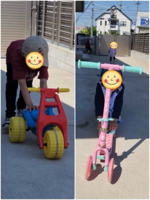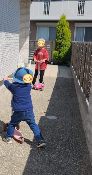 お外に出ると、キックボードに乗って止まりません!