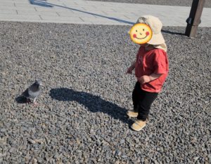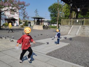 たくさんの鳩さんに追いかけられるみんな。 たくさんの鳩さんを引き連れてこっちに戻ってくるのですが、、、せんせいの方には来ないで欲しいんです。。。