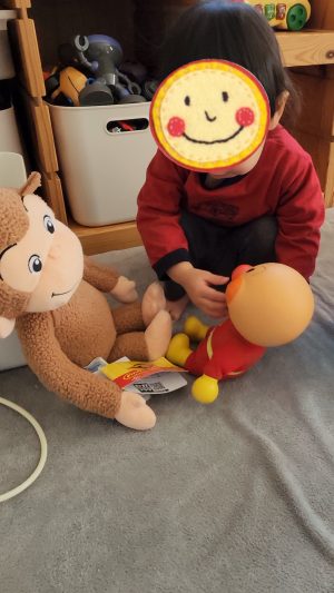 モンキー! アンパン〜!!! と、お気に入りのぬいぐるみを見つけると、ルンルンで持ってきて並べます♡