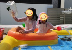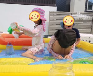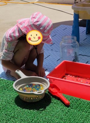 ここにお水がないよ〜! お風呂にしよ〜!!! と、プールのお水を移し替えます。