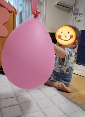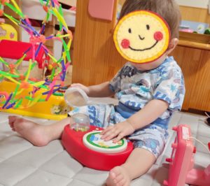 棚の上に置いてあるおもちゃを引っ張り下ろして、手の届くところに置いて、ちょっとずつ触れて楽しんでおりました!