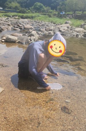 そ〜っとそ〜っと水の中に網を入れて、ヒョイ!っと持ち上げますが、やっぱり逃げられちゃう😅
