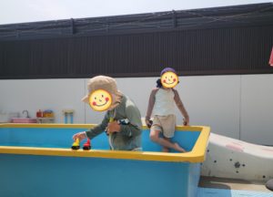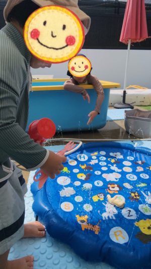 あれもこれも〜!!! と、気になるおもちゃを手にもち、並べて、お水に浮かばせたり、噴水の中へポイ!