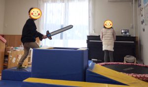 剣を持つとマットの上を飛び跳ね続けます♬ 見えない敵と戦い続けます!