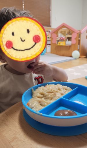 もうご飯も食べちゃおっか〜! と、用意をすると、自分で食べる! と、スプーンを使ったり、手づかみでパクパク頬張りました😋