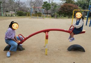 シーソーは、大きな女の子が勢いよくキックすると、小さな女の子が吹っ飛んでいきそうになります。