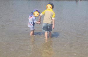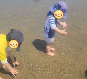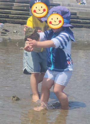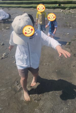 いろんなものを見つけて持ち上げて、また水の中に戻すのも楽しい! でも、、、近くで潮干狩りをしている人もいるので、控えめにもして欲しい。。。