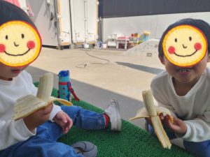 午後のおやつはお庭でいただきました🍌