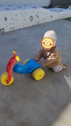 この車、足を前に出しながら乗らないと、後輪に足が当たってしまって、うまく進めないのですが、、、ちょこちょこと足をうまく動かして、前に進むコツをあっという間に習得!!