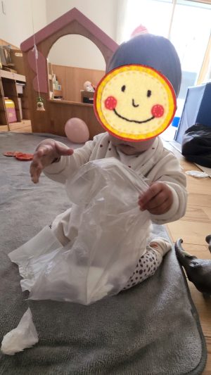 ビリビリ〜っと破ることも楽しんで、、、袋に入れてお片付け〜!!!