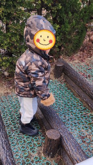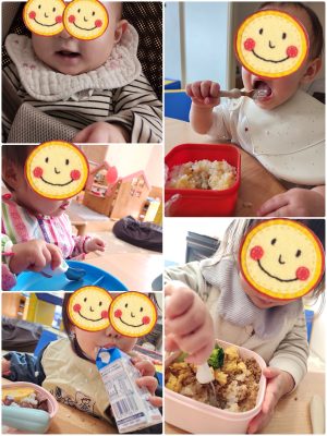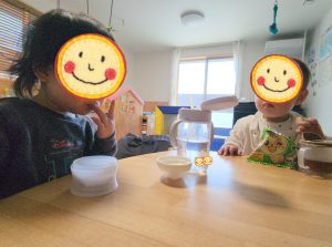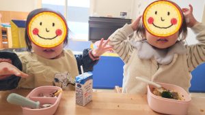 お友達のおやつも気になってそ〜っと手を伸ばしちゃうことも・・・😆 ちょっとこれはダメだよーーーー! と、さっと引き下げて守る2人・・・😆