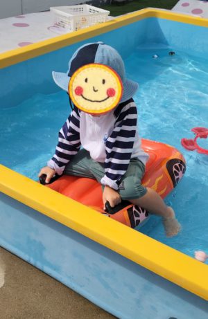 帰ってきてからは、こんな感じで足だけプールにつけて遊んでおり、水着には着替えなくてもいい〜! と、言っていたのですが、