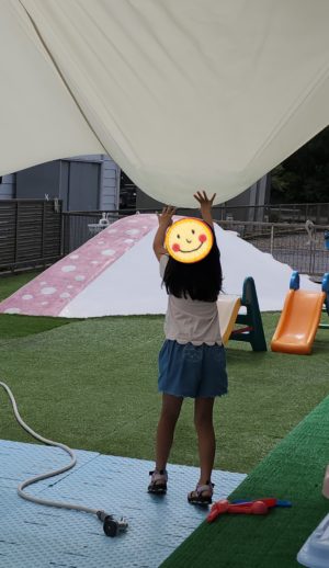 ぽ〜ん! と、弾かせるたびに大騒ぎしながらお水から逃げ回っていました♬