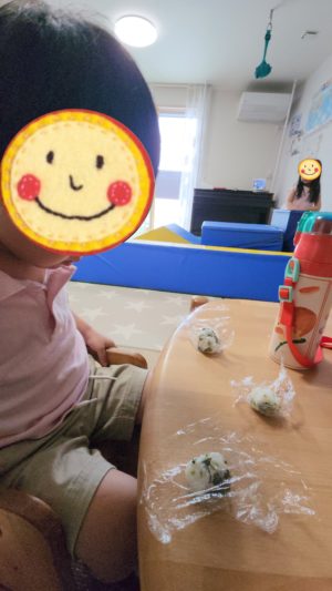 朝食のおにぎりのラップをとって、どれから食べようか悩んでおります🤣