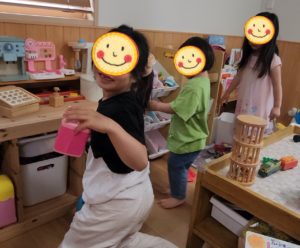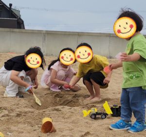 どのオモチャを使おうかなぁ〜???? と、選んだり、一緒にお山つくろ〜! と、誘い合ったりと、海でもみんなで頭を突き合わせて遊びます😊