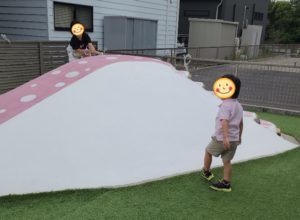 お山の滑り台はロープの方から登れることがみんなの目標!
